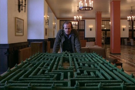 Un motivo simile è quello "del perpetuo ritorno dell’uguale, la ripetizione degli stessi tratti del volto, degli stessi caratteri, degli stessi destini, delle stesse imprese delittuose e perfino degli stessi nomi attraverso generazioni che si susseguono" (3). Il ritorno non intenzionale provoca sentimento di impotenza e turbamento. Quando, il primo giorno, il capocuoco mostra a Wendy l’immensa cucina lei dice: "E’ un enorme labirinto, mi dovrò riempire le tasche di briciole di pane altrimenti mi ci perdo qui". Ed è proprio il labirinto un elemento centrale di questa riflessione: un giardino-labirinto, infatti, è posto all’esterno dell’hotel e pare sempre al confine tra l’essere innocuo e inquietante, tra essere mezzo di salvezza o di distruzione. Il labirinto compare per la prima volta quando Wendy e Danny vi entrano per giocare mentre Jack tenta di trovare concentrazione per scrivere lanciando una palla da baseball contro il muro. Il labirinto compare anche nella fase finale del film, quando Jack rincorre il piccolo Danny per ucciderlo: la furbizia del bambino riuscirà a salvarlo, a farlo venir fuori, al contrario di Jack che, non riuscendo a trovare fiato per continuare, dopo la rincorsa, morirà congelato. E ancora, il ritorno dell’uguale c’è quando Wendy cercando Jack, poco prima della fase finale del film, si avvicina alla macchina da scrivere e trova pagine e pagine che riportano tutte la stessa scritta: All work and no play make Jack a dull boy (tradotto in italiano, secondo la volontà dello stesso regista, “il mattino ha l’oro in bocca”) .